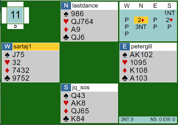 Det går an å si 1 spar, men for mange er dette en enkel hoppmelding til 2NT i andre melderunde for å vise 18-19 balanserte. Da vil man måtte ha en metode for å finne en eventuell spartilpasning, for eksempel et opplegg med Check-Back. Det er imidlertid enkelte steder i Europa man melder 1 spar i andre melderunde med slikt. Det ble hva nord gjorde, og over 1NT fra svarhånden sa nord 3NT. Da doblet Sjoert Brink (øst), og ingen hadde noe å tilføye.