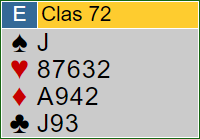Den fargen vi gjennomgikk da var enda tettere, absolutt "alt" utenom kongen og knekten. Det ble reflektert rundt hva som er beste måte å spille fargen på for fire stikk, forutsatt at det er overganger osv., teoretisk sett. I praksis er det imidlertid flere hensyn å ta enn matematikken!