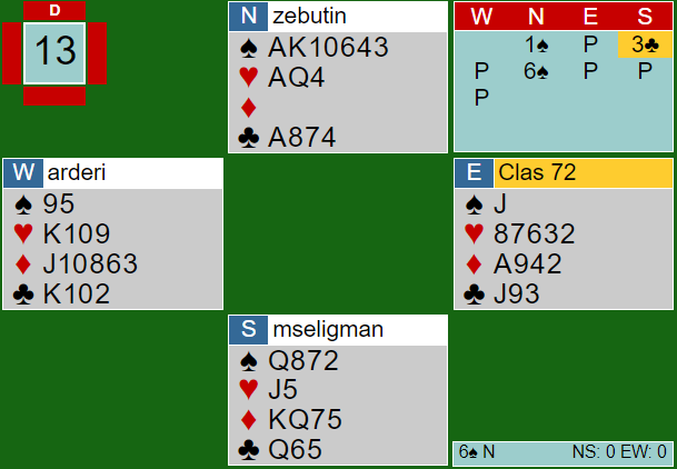 Utspillet ble stjålet og ga spillefører to stikk for ruter K-Q slik at to kløver kunne kastes fra nord. Siden hjerterfinessen gikk ble det tolv stikk, ZELIGMAN +1430.