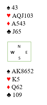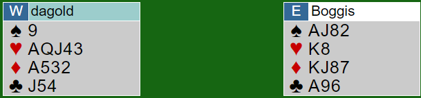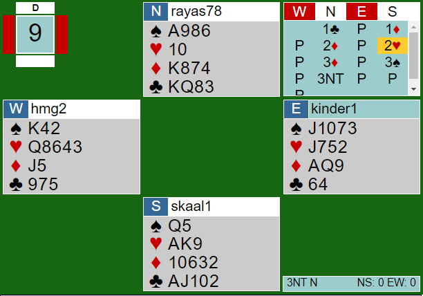 Da nord støttet til 2 ruter over svaret 1 ruter ble det annerledes. Syd viste hjerterverdier med 2 hjerter, og i neste runde sa han 3 spar for å spørre hvordan det sto til i den fargen - fjerde farge krav som brukes når man ikke er helt sikker på sluttkontrakten. Dermed ble det nord som ble spillefører i 3 grand, mens syd altså skulle spille samme kontrakt der irene satt N/S.