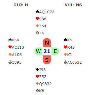 Hvis øst hadde hoppet til 2NT andre gangen (eller åpnet med 1NT) ville han blitt spillefører. Syd har da et naturlig ruterutspill. Ved fire av åtte bord skjedde det, og 3NT rullet hjem med to overstikk, Ø/V +460.