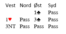 Amerikaneren på østs plass hoppet altså til 3 kløver, og vest meldte da som du ser 3NT. Nord hadde et enkelt sparutspill og kongen vant første stikk. Siden kløverfinessen sprakk og forsvaret så tok fire sparstikk ble det en bet, +50 til N/S.