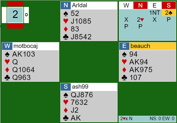 I den doblede 2 hjerterkontrakten må det nok bli minst -800. Den litt urutinerte spilleren på nords plass fikk problemer i en vanskelig kontrakt. Da røyken hadde lagt seg hadde hun fått kun tre stikk! Det betød fem doblede i faresonen, Ø/V + 1400.