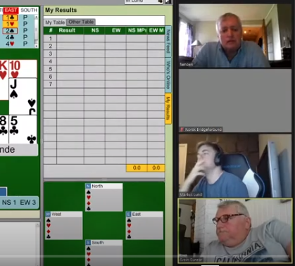 Vi fulgte kampen mellom det to sterke lagene "God (Gammel) årgang" og "Steng Oslo" - og Elllingsen-Marstrander meldte seg opp i det som ser ut som den normale utgangen 4 hjerter. Det er vel endel som risikerer å havne i 4 spar med slikt etter starten 1 kløver-1 hjerter, 1 spar (eller 2 spar), men Ø/V ved dette bordet bruket overføringer over 1 kløver, og da øst etter 1 ruter sa 1 hjerter (trekorts hjerter) endte de etter litt om og men i 4 hjerter. Det er bedre i hjerterkontrakt her, men det bør bli de samme stikkene i sparkontrakt slik det sitter.