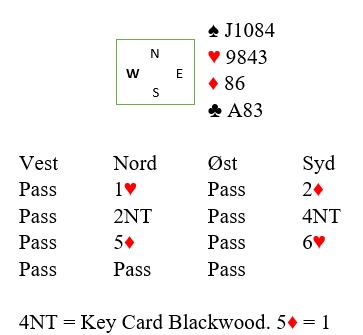 Ingen i sonen og Arne (Ø) passet med 1 NT, 10-12, fra Per Rømoen. Jeg passet også men fra Knut Molander kom kravsøk 2 ruter etter major. På det svarte Rømoen 3 kløver, 5- kort, og Molander avsluttet med 3 grand.