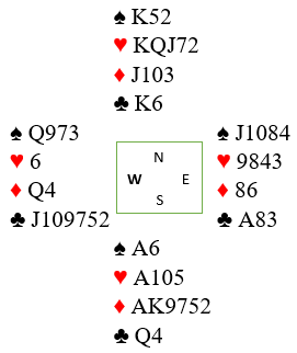 I 6 hjerter (eller 6 grand/ruter) må spillefører tippe ruteren for å vinne kontrakten. Med ni ruter til sammen hvor kun damen mangler er valget mellom å slå esset (gardere seg mot damen singel bak) og senere ta finesse, eller toppe etter damen dobbel. Sistnevnte variant er marginalt bedre hvis man ikke har noen indikasjoner. Kun en spillefører bommet ruteren i 6 hjerter og gikk bet, 19 par vant slem.