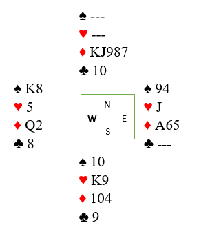 Spar 9 ble spilt til syds tier og kongen, og nord skulle gjøre et avkast. Det var hans siste sjanse til å kaste på kløver 10. Men husk nord så ikke vest sine kort, og vest kunne jo hatt kløver 9, ikke sant? I så fall vil å kvitte seg med tieren være å forære spillefører stikk for kløver 9, og det blir det tiende stikket. Etter litt betenking kastet nord ruter 9 i tredje trumfrunde. Det ga Nick en sjanse han grep begjærlig ved å spille kløver 8 og la nord få beholde for kløver 10 mens hjerter knekt forsvant fra blindemann. Avslutningen var at nord måtte spille ruter unna kongen slik at det ikke ble rutertaper. Dermed var det en fet +620 til notering.