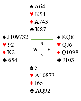 Det første du bør tenke på (som ble nevnt) er at det var tilsynelatende tre tapere, en i trumf og to i ruter. Alle som ser på innser raskt at kløveren ikke er et problem denne gangen, den gir jo fire stikk. Men det vet ikke den som spiller, og om det er bare tre kløverstikk må spillefører få gjort noe med sin fjerde kløver. Det går greit om man tar to store hjerter og spiller tre ganger kløver fra topp. Hvis ikke den fjerde kløveren gir stikk kan den trumfes hos nord.