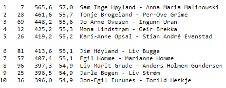Medaljekampen ble tøff, og 10-15 par var i bildet. Sølv gikk til Tonje Brogeland-Per Ove Grime, mens Jo Arne Ovesen-Ingunn Uran ble nr. 3.