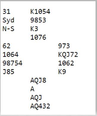 Før vi får tak i spill fra høstmesterskapet sakser vi et spill fra bulletinen. Fred Stewart skriver bulletin-spalten Tips For Beginners som dette spillet er hentet fra. Så det er ikke veldig avansert stoff, men i den spalten finnes likevel nyttige tips for spillere som ikke er så erfarne.