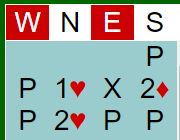 2 ruter fra syd etter østs dobling er en overføringsvariant og viser en god løft til 2 hjerter. Idet nord sier han ikke tror det står mer enn 2 hjerter går det to passer tilbake til vest. Ville du meldt noe nå?