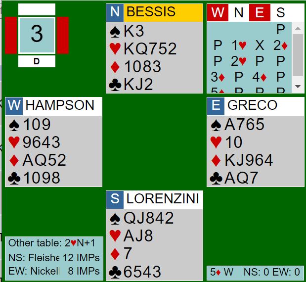 Ved det andre bordet spilte altså N/S 2 hjerter og fikk ni stikk. Mot Hampson sin 5 ruter spilte nord ut trumf. Ruter 9 vant første stikk. Hampson spilte i andre stikk liten spar fra bordet. Nord kom inn og spilte nok en trumf. Den ble vunnet hos øst, så vest beholdt A-Q i trumf så han kunne trumfe spartaperne høyt. Spar ess ble spilt, så spar til stjeling med ruter dame. Nord kastet en hjerter. Det blir verre for spillefører om nord kaster en kløver i det stikket. Inne hos vest ble kløver 10 spilt, nord dekket med kongen og esset vant stikket. Så den siste sparen stjålet med esset. Hvis nord hadde kastet kløver da den første sparstjelingen ble tatt, så enda en kløver nå i tillegg til at det var spilt en runde kløver ville spillefører vært i trøbbel siden nord plutselig ikke har flere kløver, og han har fortsatt en trumf. Hvordan komme seg over til øst for å ta ut nords siste trumf? Men nå var det for sent for forsvaret. Hampson kunne ta nok en kløverfinesse og notere elleve stikk, +600 og 12 IMP.