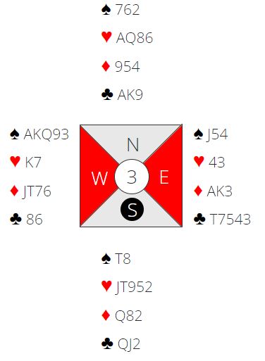 Dette spillet er fra søndagens spilling i Soloway Teams i Atlanta. Her var det voldsomt tøffe tak. Du kan prøve deg med vests kort.
