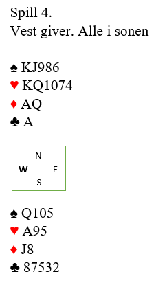 Resten står hvis hjerteren går. Men er det ikke sannsynlig at hjerteren sitter skjevt her? Vest har meldt inn på tre-trinnet i faresonen med kun ruter konge på topp i fargen sin. Ligner det ikke veldig på at han må ha god fordeling, for å melde inn med en tynn farge og jevn fordeling på tre-trinnet i sonen er ikke vanlig. Det er riktignok Fredin som sitter vest, og han er jo litt uberegnelig, men likevel.