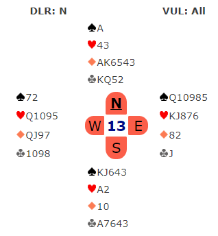 Det var naturlig nok ikke lett å finne 6 kløver i dette spillet. Åpneren vil jo vise en 12-14 grand.