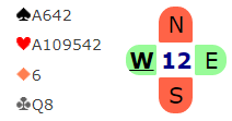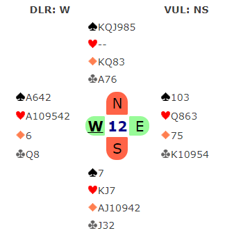Så kom spill 11, det nest siste og jeg satt igjen Vest og hårte at motparten i Syd åpnet med 1 spar med ingen i sone og der Nord hoppet direkte til 4 spar. Da var Syd tydeligvis i tvil om å gå videre men valgte å passe. Ergerlig tenkte jeg med sp J9873 imot og er sp 10 i Syd vil det nesten garantert bli to stikk i trumf på meg. Nøytralt utspill, ruter eller hjerter er nærmest likeverdig og ru 7 ble valgt. Farlig å spill ut fra J52, det koster ofte stikk, sørlig om makker bare har damen tynt i fargen.