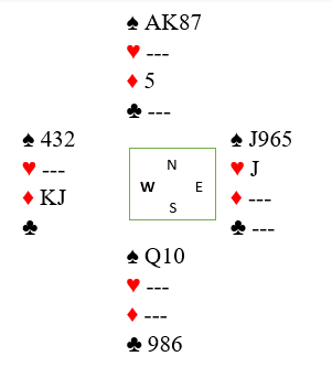 Wow, litt av en spilleføring dette, men på en måte logisk når en tar i betraktning at vest må ha lang ruter og en fordelingshånd. Likevel er det temmelig sjeldent. I to farger hvor spillefører rår over A-K-Q tar han finesse på direkten med tieren! Det måtte til for å vinne 6 hjerter som ser nokså håpløs ut med den skjeve sitsen.