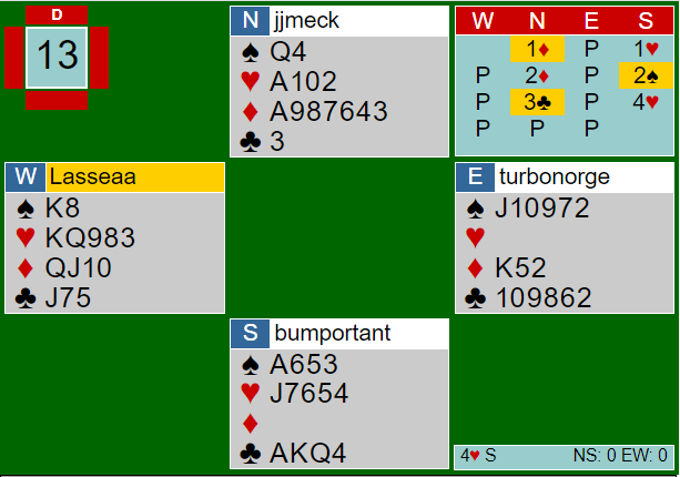 Dette er en fin lilleslem i hjerter (eller grand), men ikke mer. De finner raskt ut det er poeng nok til lilleslem, og at styrken er i nærheten av god nok for storeslem. Men hvis hjerter blir satt som trumf bør det kunne fastslås at å melde 7 hjerter er feil, for at hjerteren går er litt for liten sjanse.