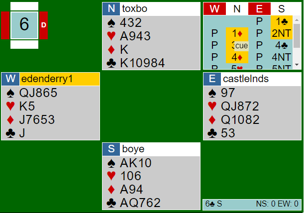 Over åpnerens hopp til 2 grand spiller Tonje og Boye med et godt system hvor de får vist en rekke håndtyper svarhånden kan ha. Med mange hjerter og spar er det lave meldinger tilgjengelig, så 3 spar er ledig. Nords 3 spar viste i denne situasjonen kløverfarge (minst femkorts farge). Det passet perfekt for syd som fastsatte trumfen med 4 kløver. Siden nord var med på notene med en kontrollmelding (4 ruter) gikk Boye på med Key Card Blackwood. Siden alle nøkkelkortene og trumfdamen var på plass måtte han varsle fra om det med 5 grand. Nord er jo ubegrenset, så syd kan ikke ta noen avgjørelse om at at storeslem er utelukket og overlater det til nord. Hun hadde ikke mer enn sånn akkurat for lilleleslem og slo av med 6 kløver.