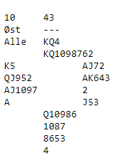 Med ruter ut i stedet for kl A kan ikke Vest vinne, sjansen er at Nord har ru K, men finessen mislykkes. 6 hjerter hjem ga oss 0%, renspika bunn, en bet og 50 inn hadde ikke gitt ren topp men nesten!
