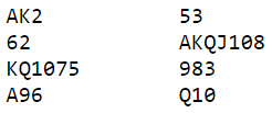 Denne planen fungerer heller ikke så godt mot Q10xx i hjerter i vest, men da er jeg også usikker på om det er like rett frem å få 11 stikk? Det kan du få pusle med selv.