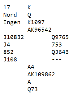 Det så ut som kun ni stikk fra taket, men det er hvis det blir fem kløverstikk. Spar 3 kom ut til damen og esset. En kløver ble spilt til bordet til liten fra nord og honnør, og den nitriste sitsen i fargen ble oppdaget. Da var det kun åtte sikre stikk.
