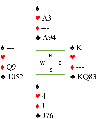 Se en gang til på kløverfargen. N/S har ingen kløverstopper i det hele tatt, men kombinasjonen de har og småkortenes plassering Ø/V gjør at fargen er dønn blokkert, motspillerne kan ikke få tatt mer enn fire kløverstikk.