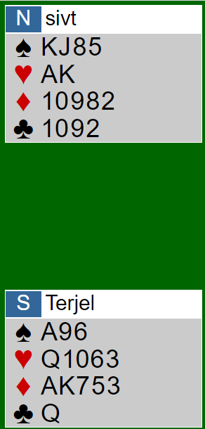 Ved vårt bord ga på en måte spillefører opp, eller det han gjorde var å låse seg på sitsen i kløver da han spilte A-K-J og oppdaget at det ikke gikk å få tre kløverstikk siden øst var fri tredje gang. Da var det bet, vest fikk to ruterstikk til slutt.