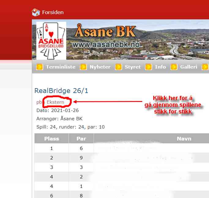 Linken til en ferdigspilt turnering finnes i den ordinære resultatfilen som man finner via vår hjemmeside, under Resultater. Når man velger en turnering på denne siden får man opp en resultatliste som ser ut omtrent som bildet under. Ved å klikke på "Ekstern", like under navnet på turneringen, blir man videresendt til turneringsarkivet hos RealBridge. Så er det bare å kose seg med endeløs analyse av spill og meldinger.