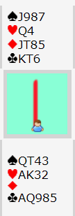 Så for ikke å bli hengende med flere rutertapere tok jeg for A-K i hjerter og kastet en ruter. Nå forsøkte jeg kløver til kongen som vant stikket, og den siste ruteren ble trumfet.