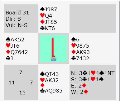 NORWEGIAN AMAZONES sitt Ø/V-par (Vist-Heskje) gjorde det teoretisk riktige da de «tok pengene» idet Ø/V var i 6 ruter. De doblet og fikk +500 hvor det altså er fare for bet i 6 spar om de melder det. N/S ved det andre bordet var Jessica Larsson og Jørgen Molberg som spiller for et svensk lag. De stoppet i 5 kløver, +420. Dermed ble det kun en liten sving i den kampen, 2 IMP i favør NORGEWGIAN AMAZONES.