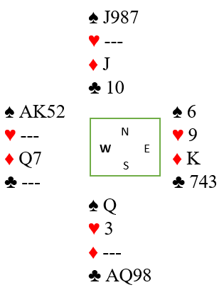 Inne på kløver konge spilles ruter til trumf, hjerter til damen og den tredje ruteren til trumf. Så tas A-K i hjerter, men fra hånden kastes ikke ruter, men en kløver. Dette er igjen: