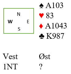 Her er et trolig mange som bare sier 3NT. Og for all del, det vil ofte gå bra. Men det er ikke utenkelig at makker har femkorts spar, og i så fall kan sparkontrakt være tryggere, og øst har som oftest en stjeleverdi i hjerter også. Ett trumfstikk på den korteste trumfhånden gir jo ett ekstra stikk. Dessuten kan hjerteren være sårbar i grandkontrakt.