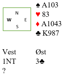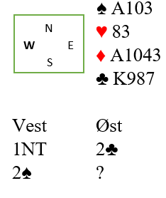 Idet vest viste fire eller fem spar kan øst spørre på nytt med 3 kløver. Idet du eventuelt gjør det skjer dette: