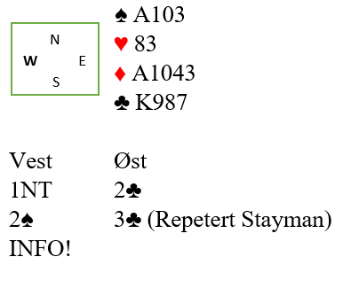 Hvis han sier 3NT passer du, og om han sier 3 ruter sier du 3NT, for vi kan ikke ha 5-3 i spar lenger. Du har nå gitt dem noe informasjon, men ikke så mye som det andre svaret etter repetert Stayman ville gitt. For eksempel, om makker viser en firekorts major over 3 kløver - Puppet (3 ru) - og du sier 3NT vet de ikke hvilken major grandåpneren har.