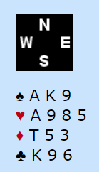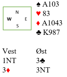 Vel, det viste seg at han hadde rett i at ruteren var sårbar, men da det ikke var noen majortilpasning ble 3NT kontrakten likevel, etter at han hadde fortalt motparten at jeg hadde spar og han selv trolig satt med hjerter.