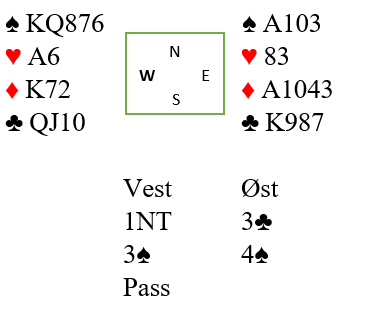Hvis svaret på 3 kløver er 3 spar sier du 4 spar og er trygg på at det må være en god utgang, og kanskje mye bedre enn 3NT. Slik så Ø/V sine kort ut da spillet forekom i en turnering forleden: