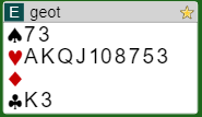 Kommer det skiftet må spillefører toppe kløveren for å vinne 5 hjerter. Det er lite sannsynlig han klarer, for det er helt klart med oddsen å ta finessen etter først å ha lagt ned en honnør, selv om tieren faller.