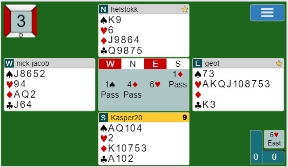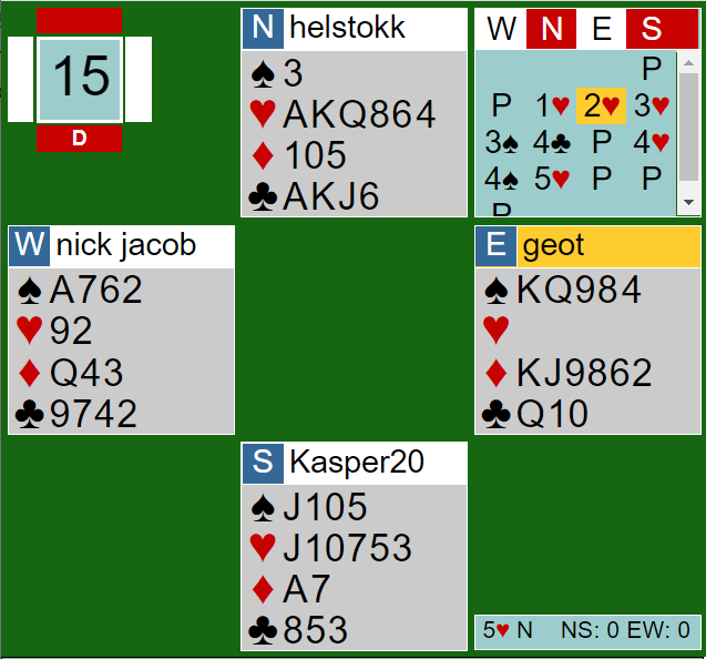 Som syd brukte jeg Michaels Cuebid - 2 hjerter - over Tor sin åpning 1 hjerter. Underveis til 4 hjerter meldte Tor som du ser 4 kløver som kan være en sleminvitt, men ofte er naturlig i en sånn sekvens, for at makker skal kunne ha mer informasjon til å kunne vurdere kortene sine senere hvis motparten stamper. Da vest stampet i 4 spar endte de i 5 hjerter.
