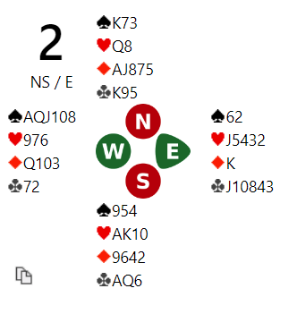 2NT var altså balansert 22-23 NT, og 4 hjerter viste sleminvitt med kløverfarge, minst sekskorts farge! Det er en bra konvensjon (4 spar viser sleminvitt med ruterfarge) da det ikke er så lett å få vist de hendene over 2NT, og 4 hjerter/4 spar som naturlig svar på en så sterk NT virker ikke særlig lurt (da overfører man til majorfargen).
