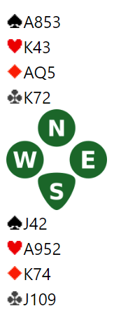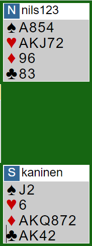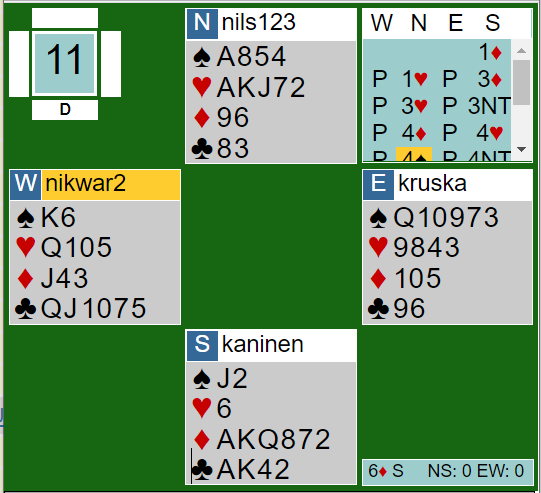 Da han spilte hjerter i stikk to og vest la på damen burde han kanskje stukket med kongen, spilt hjerter til esset og sett at nok en stor hjerter kommer på. Så spilles ruter til nord og hjerter mot 9-x som etablerer det niende stikket for hjerter 9.
