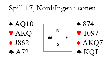 Nord visste det var voldsom fordeling og ville likt å spille ut trumf, men det hadde han ikke. Så han spilte ut en liten hjerter til esset. Nå hadde Ellingsen ikke så store problemer, han kunne kryss-stjele, og inkludert ett stikk for hjerter konge ble det greit å notere ti stikk, +590.