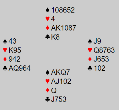 Nord åpner med 1 spar, og slik de som spiller med 2-over-1 som utgangskrav blir syd sitt svar 1NT. Uten spesielle avtaler blir det da litt gjettekonkurranse for nord. Hans hånd er ikke så sterk i form av HP, men med 7-4 fordeling og gode farger kan det stå slem om syd har de riktige kortene. For eks., la oss si syd har Q, eller QJ i hjerter i stedet for de fem poengene i kløver. Så det kan stå slem.