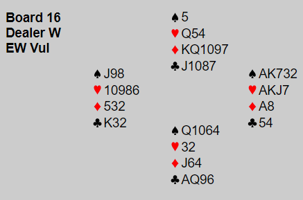 I ett av de siste spillene hadde begge lag sitt Ø/V-par en god sjanse da N/S spilte 3NT med kløver konge singel mot 10-9-x. Ø/V kunne hente seks kløverstikk!