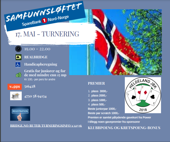 Helgeland Juniorbridgeklubb (HJBK) skal i samarbeid med Sparebank 1 Nord Norge (og noen andre sponsorer) arrangerer bridgeturnering på 17. mai.