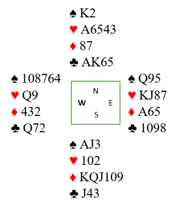 Hvis han hadde sikret seg inntak til syd ved å stikke opp med spar konge i første stikk får han fire ruterstikk og enkelt minst ni stikk (2+1+4+2=9).