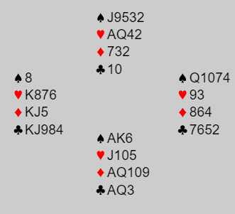 Etter pass fra vest åpnet Harding (nord) med 2 ruter - en Ekrens 2 ruter-variant - som viste begge major og mindre enn 11 poeng. Nå vet Fuglestad (syd) at de trolig har en 5-3 tilpasning i major, men hun satset likevel på utgang i grand med de flotte verdiene i minorfargene. Det viste seg å være veldig riktig: