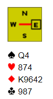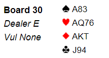 Hvis det spilles med sterk NT åpner syd med 1 i minor, og nord svarer 1 hjerter. Syd støtter til 2 hjerter. Nå er det kanskje mulig for nord å tenke på slem, men en bør ha et apparat (2NT?) for å finne ut mer om åpnerens fordeling. Skulle han for eksempel ha singel kløver er det bra sjanser for slem. Idet syd viser minimum og balansert håbd bør det slå fra seg alle tanker om slem. Men de kan kanskje ende i 4 hjerter.
