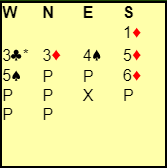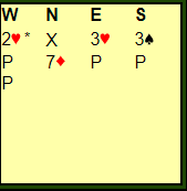 Ved det andre bordet åpnet VIEGO sin vest med 2 hjerter, og nord doblet. Øst høynet til 3 hjerter. Da var syd med til 3 spar, en fristende men nokså tøff melding. Er det så rart nord tror det står i storeslem nå? Jeg har litt sympati for nords avsluttende melding. Hele meldingsforløpet ble slik: