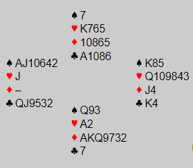 Det blir dog en grense for hva som kan gjøres om på (undo), synes jeg. Hvor den grensen går vet jeg ikke, men det er kanskje noe som må avklares for senere arrangement av denne typen. Jeg klikket selv feil et par-tre ganger. Kun en gang kostet det. Jeg skulle stikke meg inn på kløver ess og så bestemme meg for fortsettelsen. Da jeg satt og tenkte på fortsettelsen hadde spillefører fortsatt med en kløver, og jeg satt der og tenkte! Jeg hadde i stedet for å stikke med esset lagt kløver 8, kortet som stod ved siden av esset. Burde jeg nå fått undo?